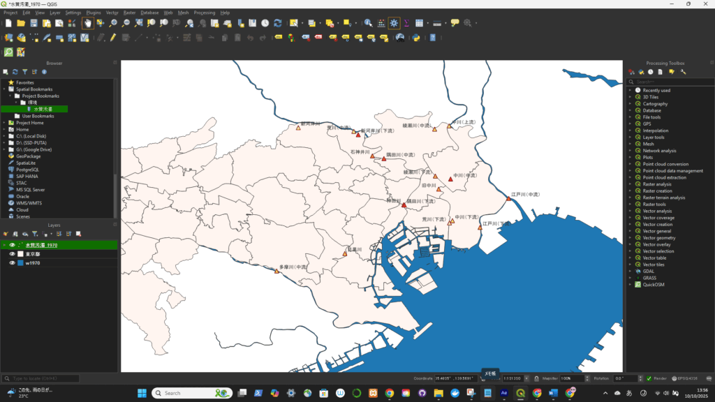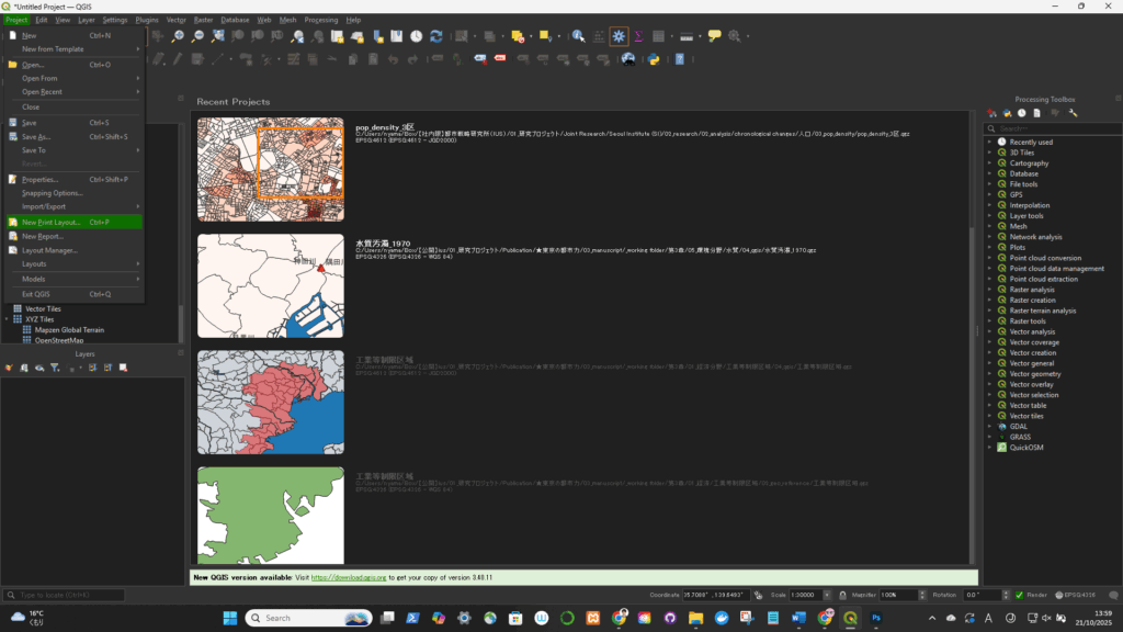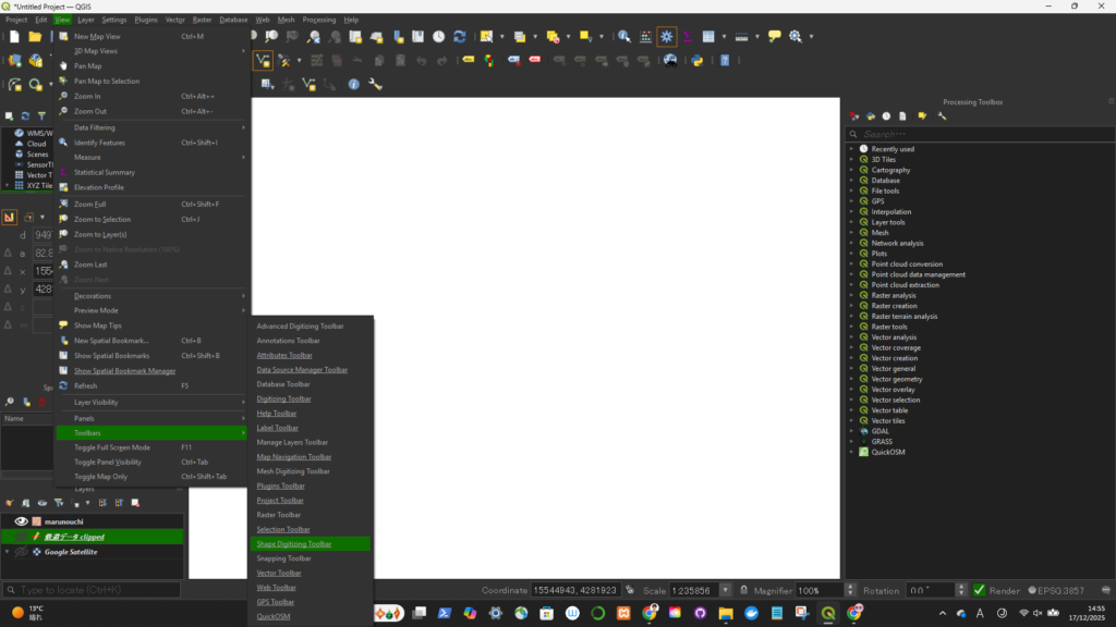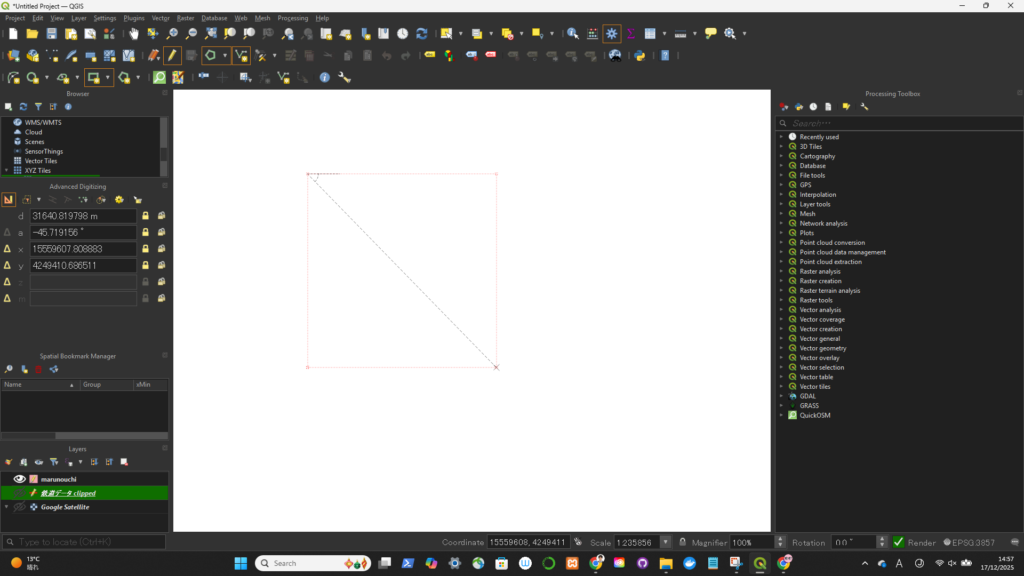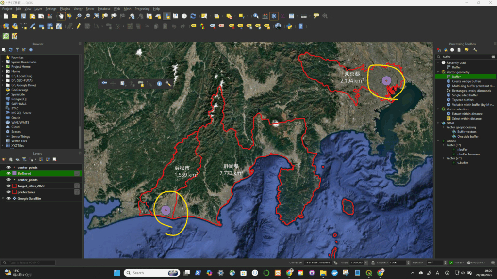 一旦、座標系(CRS)を変更(4326->3857)してから、円を描いた。degree単位をkmに変更するため。