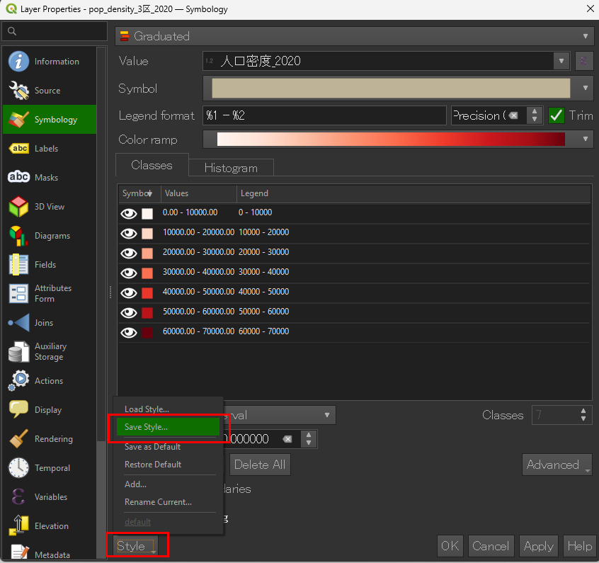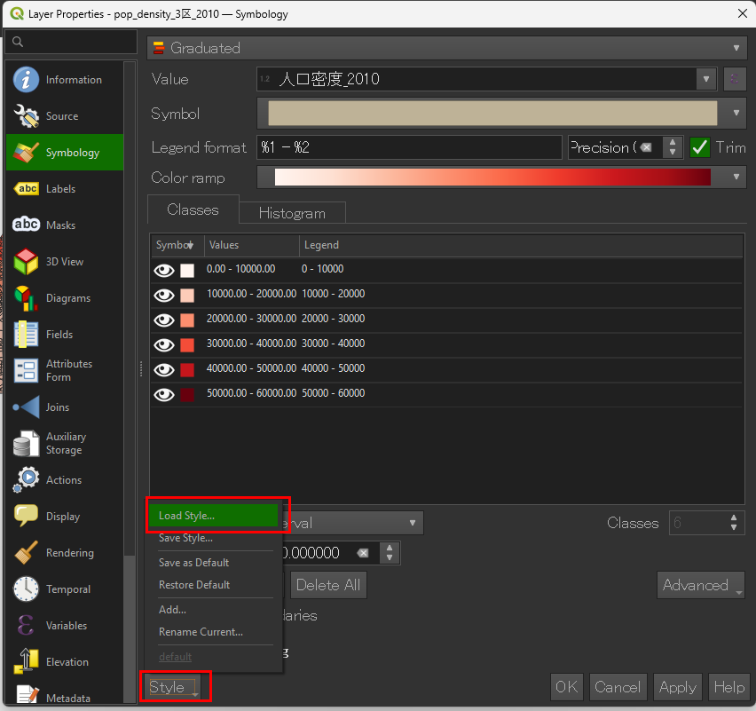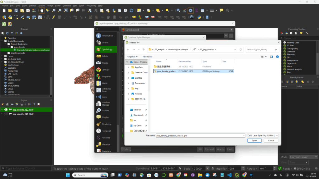 .qml ファイルを選択すると、色分け・範囲・ラベル設定が全て再現されます。■保存時