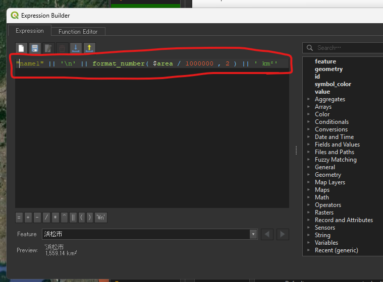 平方キロメートルの場合: ”<name>” || ‘\n’ || format_number( $area / 1000000 , 2 ) || ‘ km²’