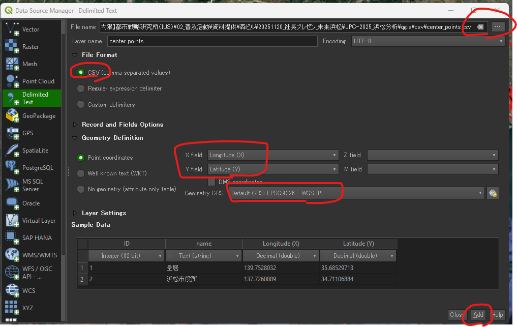 .csv file.Longitude (X)).Latitude (Y)).EPSG:4326 - WGS 84.
