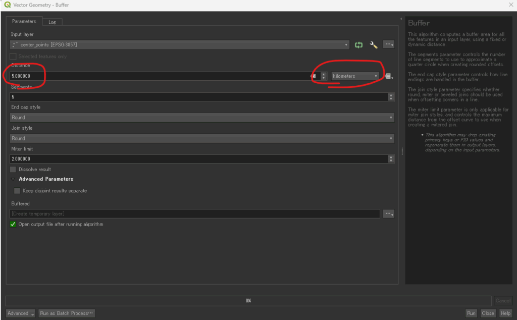 | Distance unit | Select: Kilometers | Crucial: Setting the unit here tells QGIS exactly how far to calculate the buffer. |