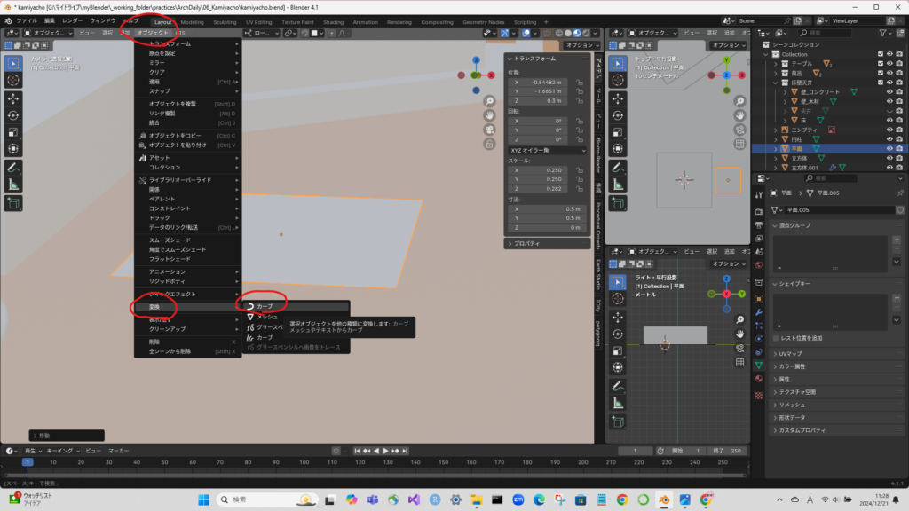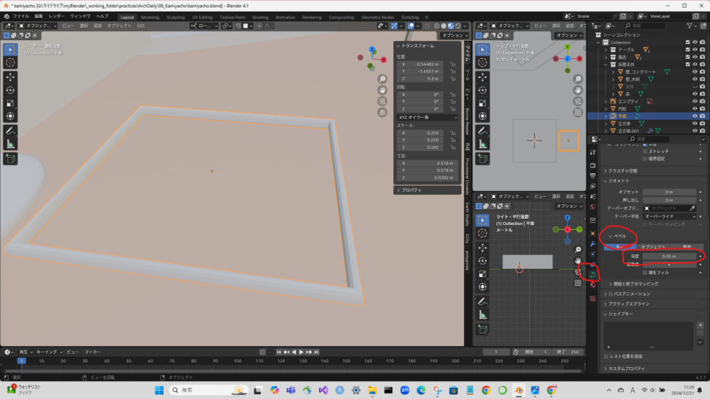 オブジェクトデータプロパティのベベルの深度でカーブに厚みを与える。