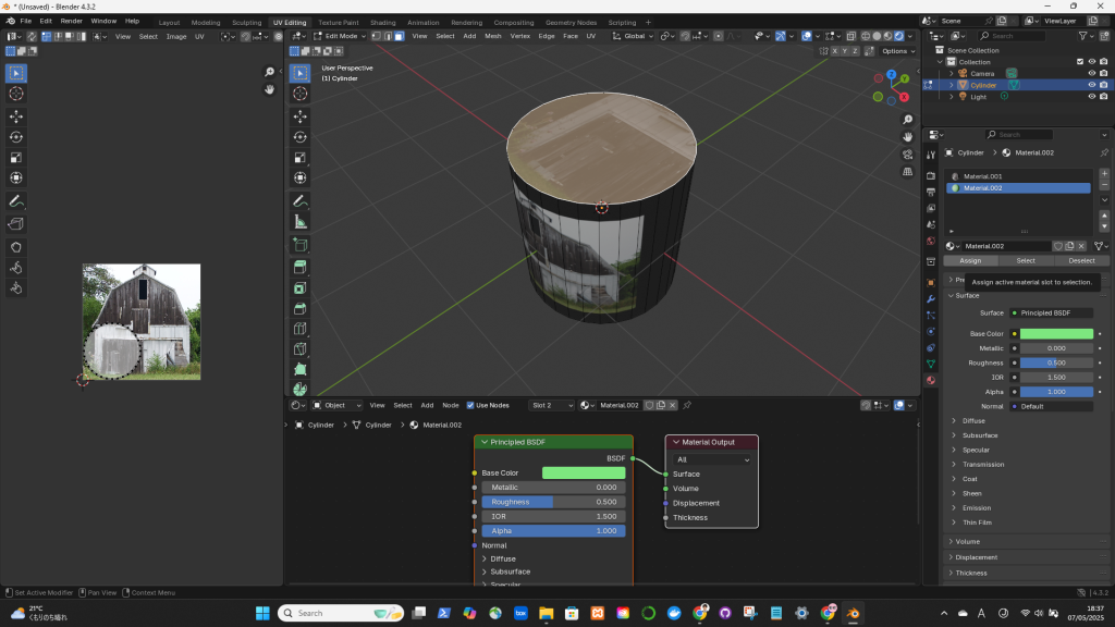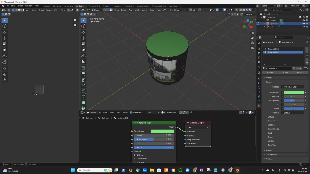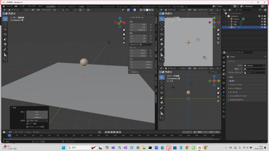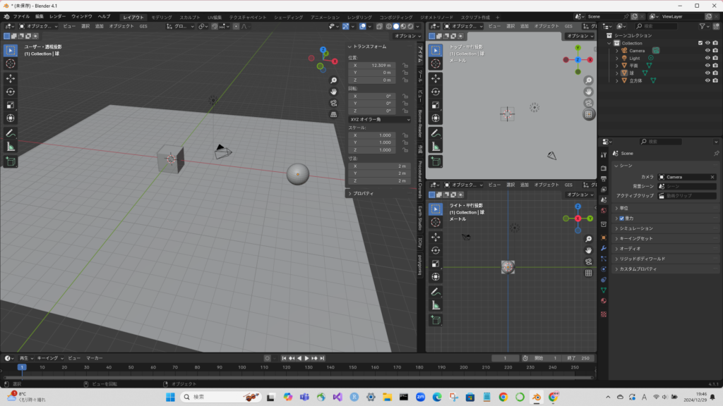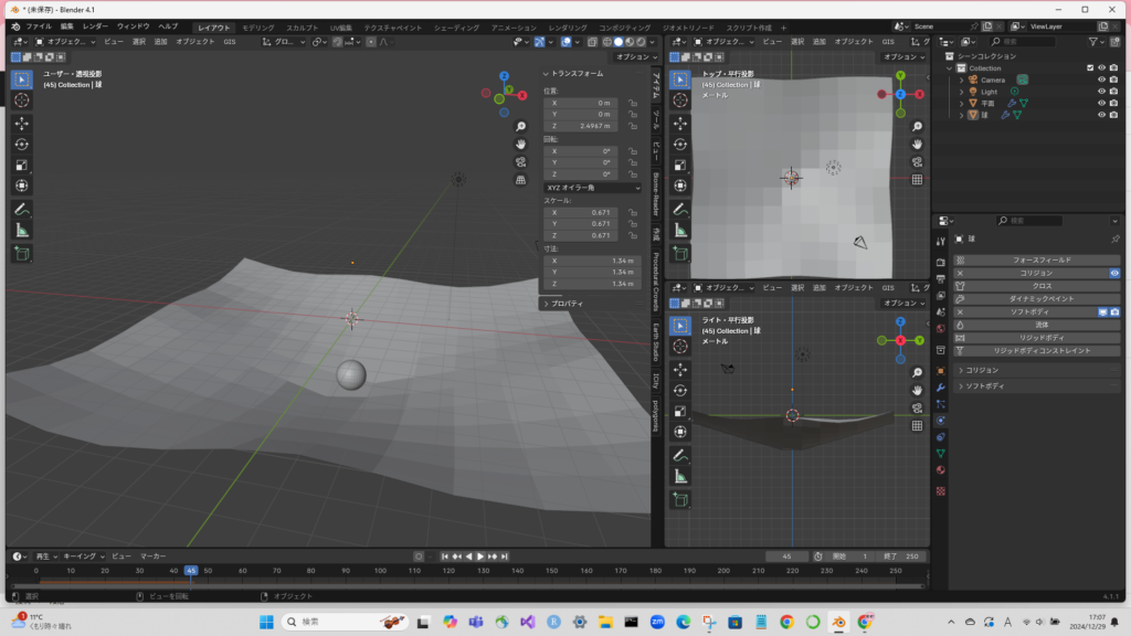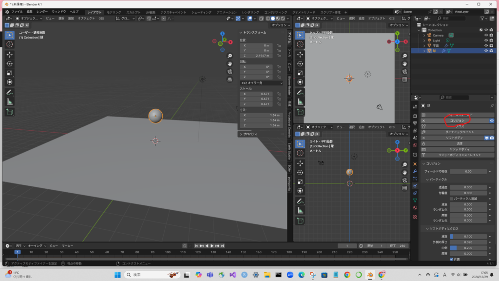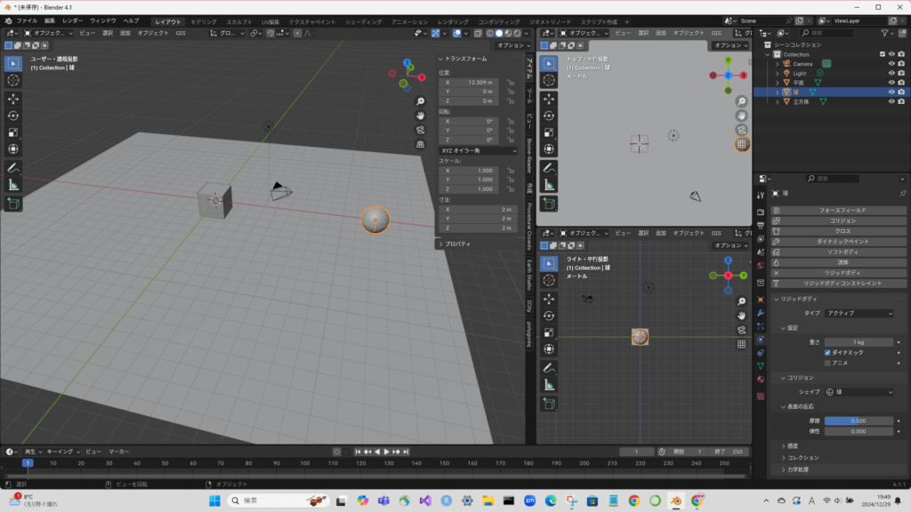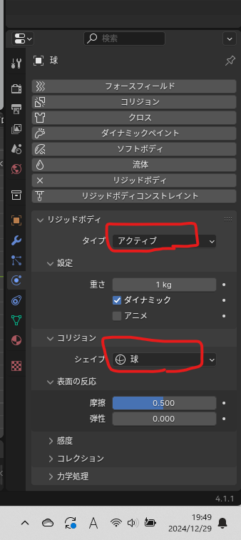 UV球にも「リジッドボディ」を追加する。設定は「アクティブ」と「球」にする。