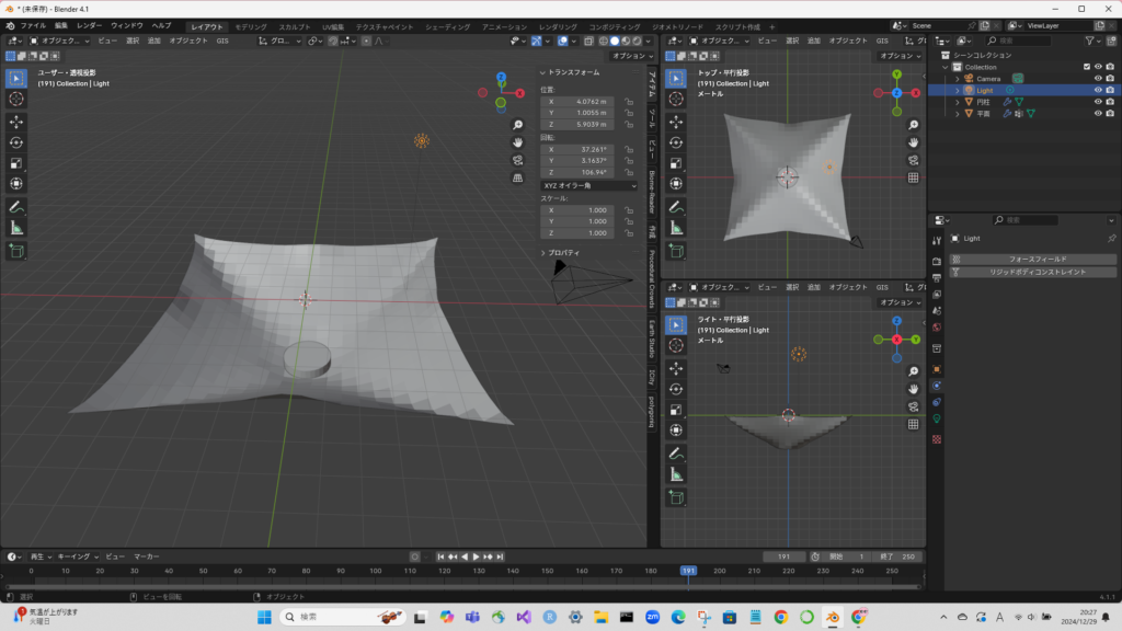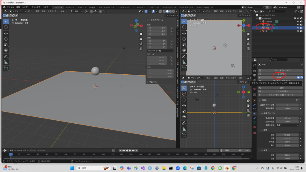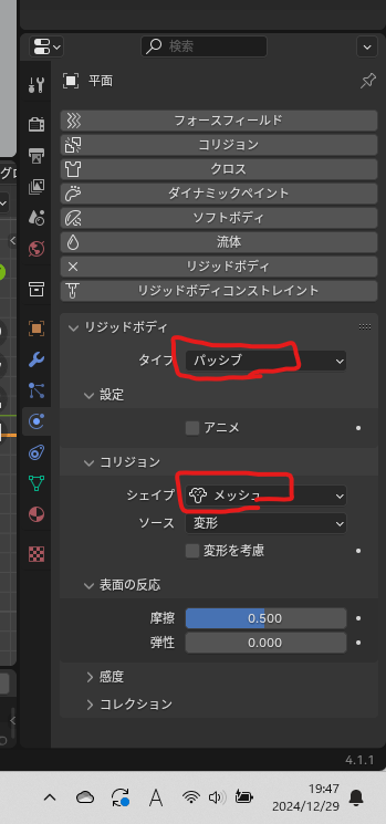 平面に「リジッドボディ」を追加する。設定は「パッシブ」と「メッシュ」にする。