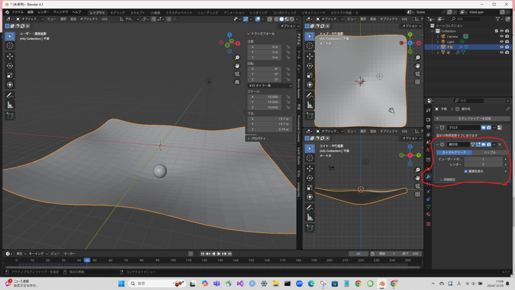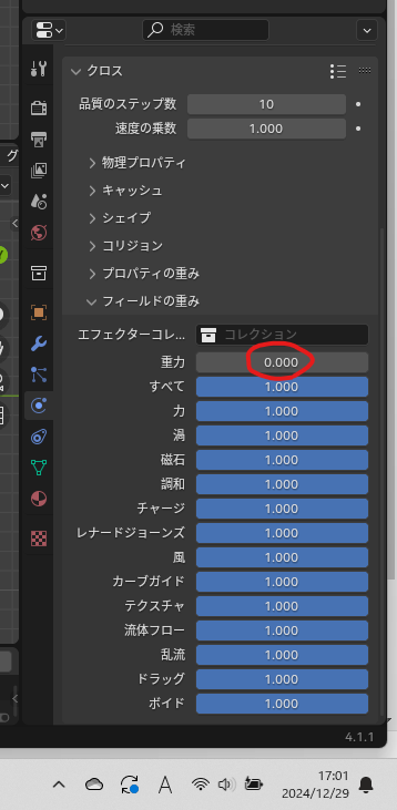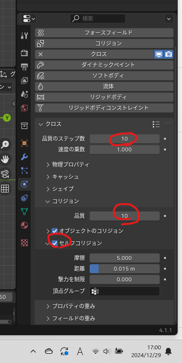 「品質のステップ数」と「コリジョン→品質」をともに「10」にして、「セルフコリジョン」にチェックを入れる。