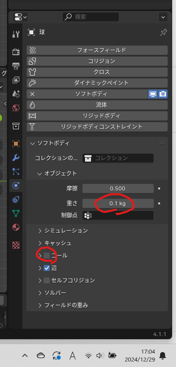 ソフトボディの「重さ」を「0.1kg」、「ゴール」のチェックを外す。