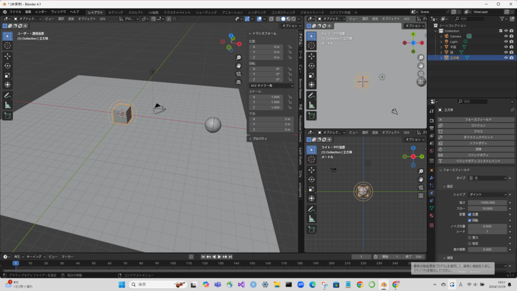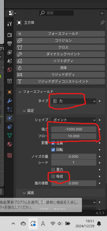 立方体に「フォースフィールド」を追加する。設定は「タイプ:力」で、「強さ:-1000」、「フロー:10」としてみた。