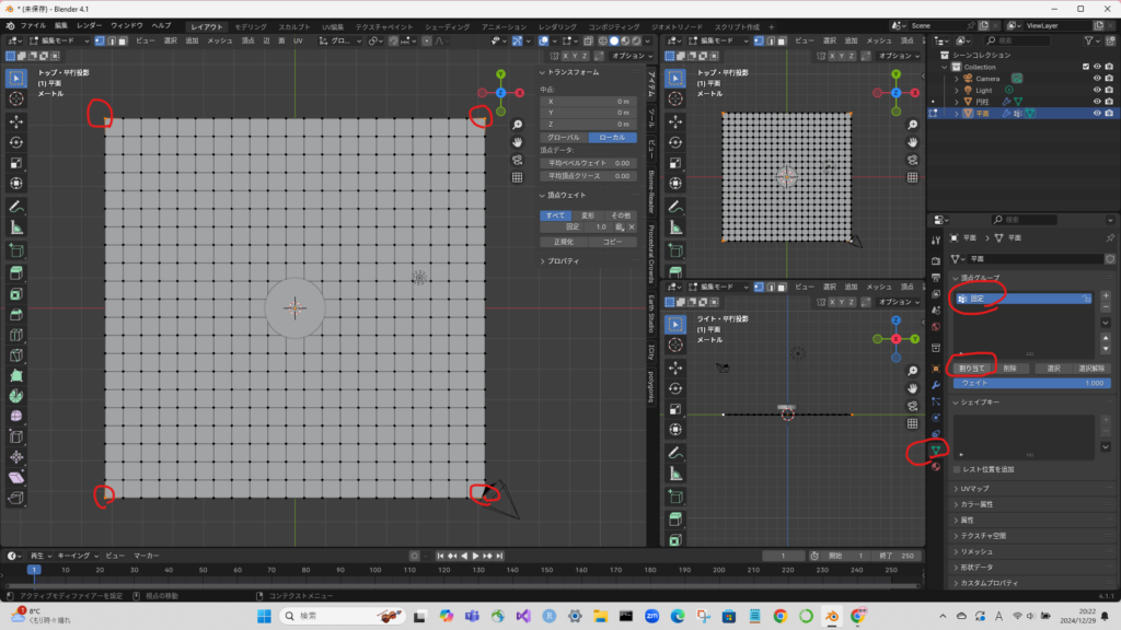 オブジェクトデータプロパティで、頂点を追加して、適当な名前(「固定」とした)を付けて、「割り当て」ボタンを押す。