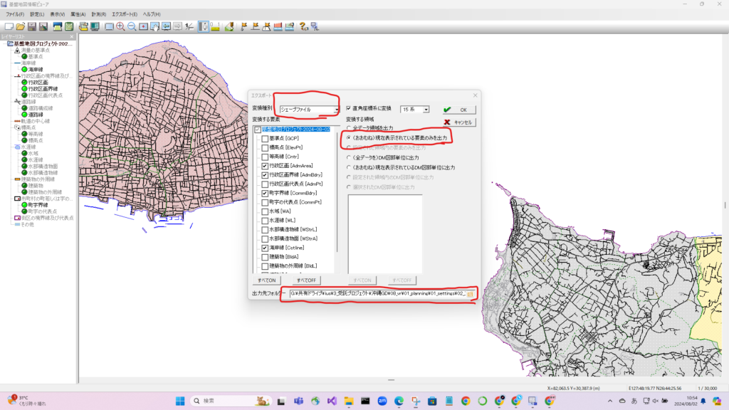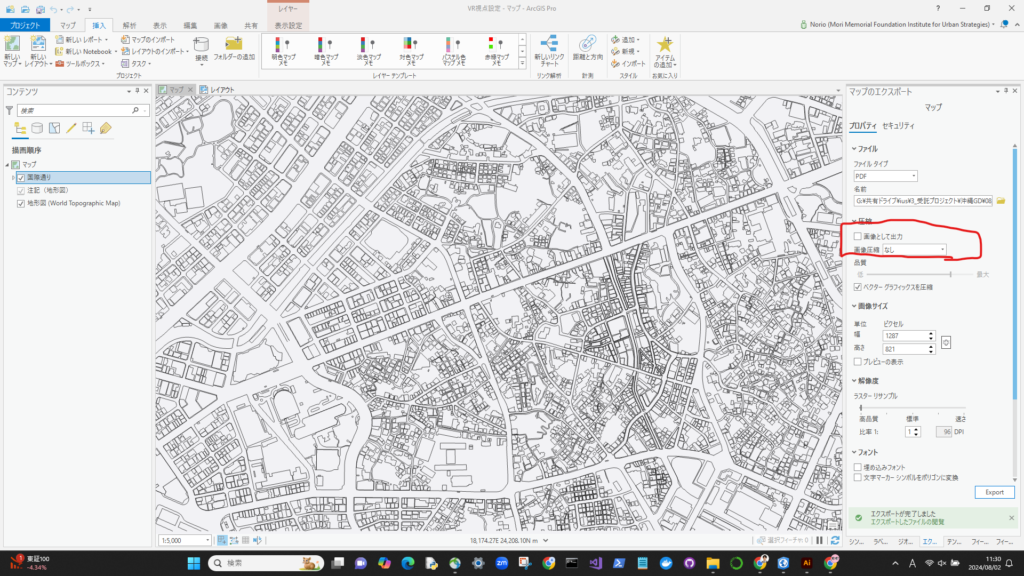 シェープファイルでエクスポートして、ArcGISで作業して、PDFに書き出し(画像として出力のチェックを外す)。