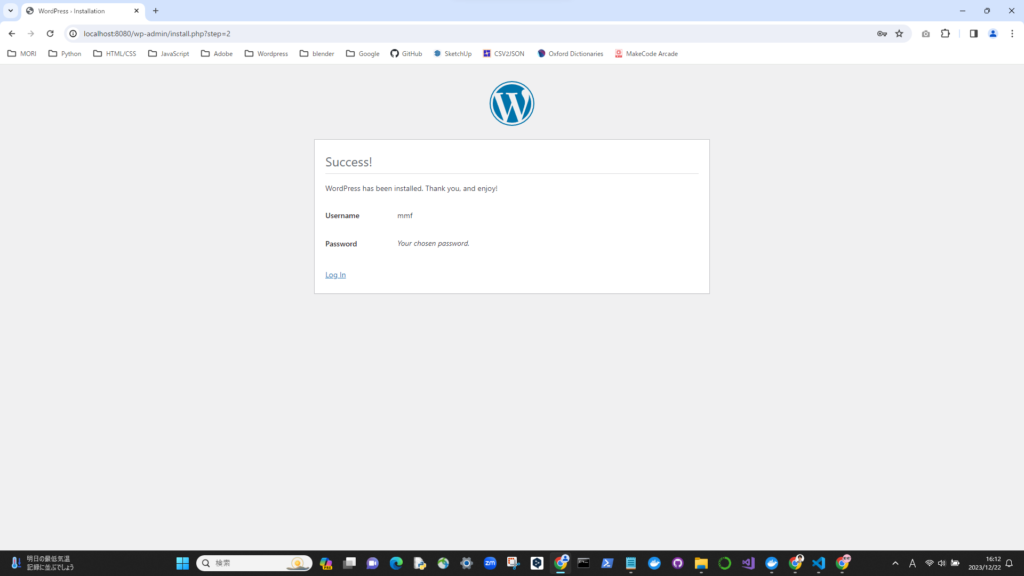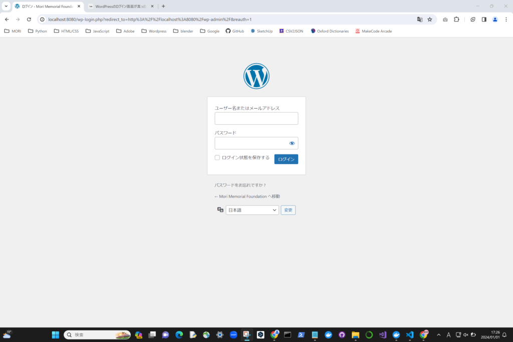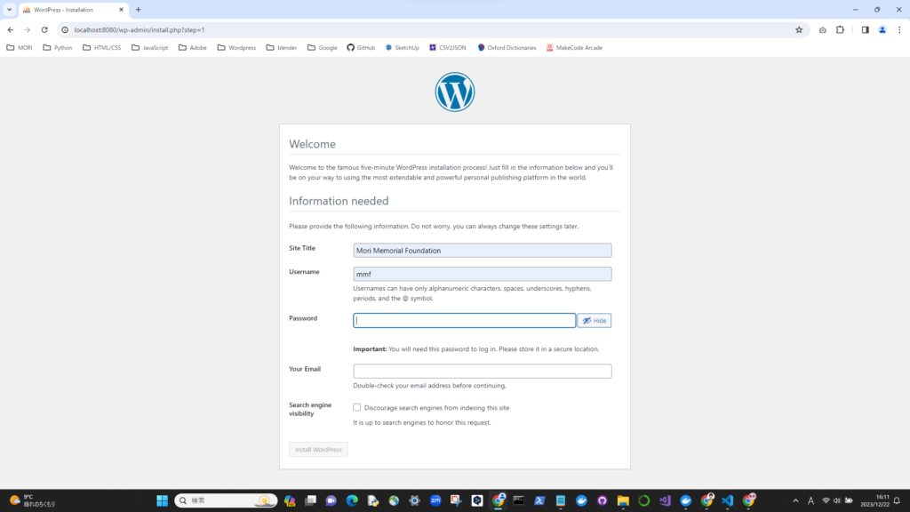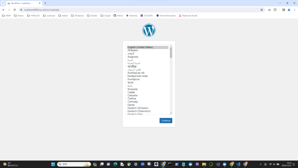 【注意】http://localhost:8080 を入力すると当初は「ページが読み込めません」のようなエラーメッセージがでるが、5-10分くらいするとWordPressのインストール画面が現れる。