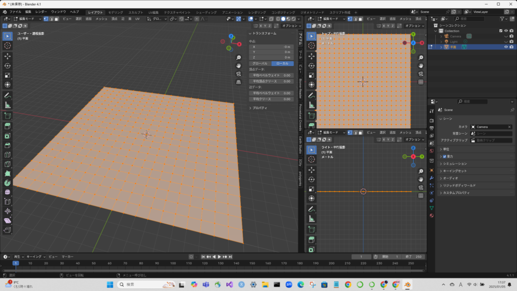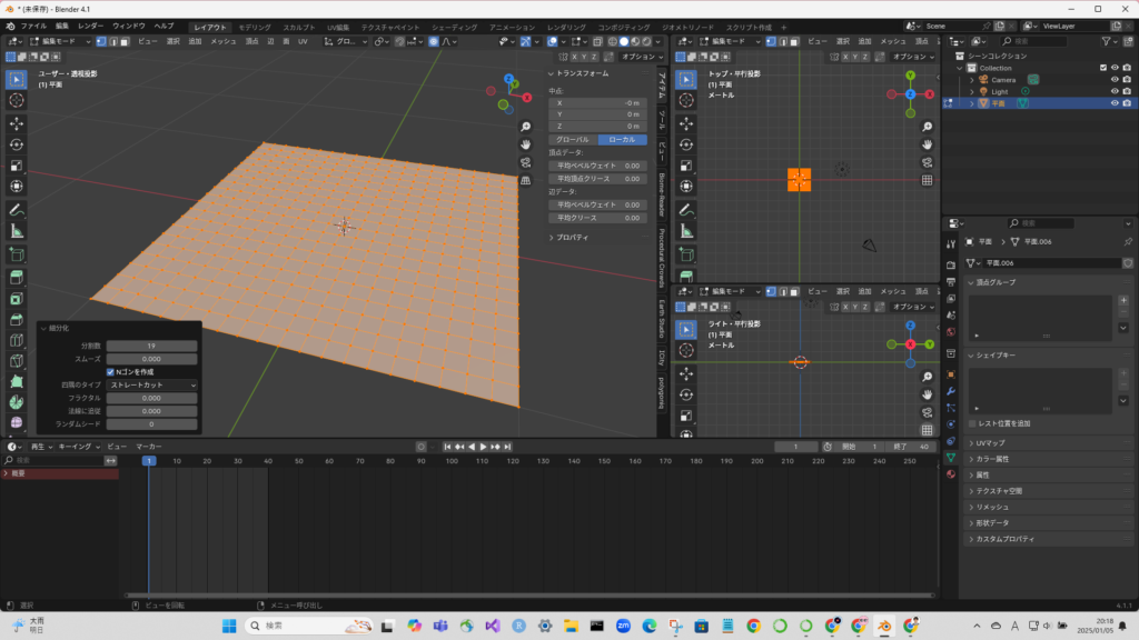 編集モードで、平面を細分化しておく。