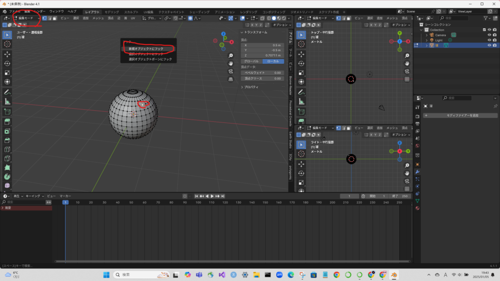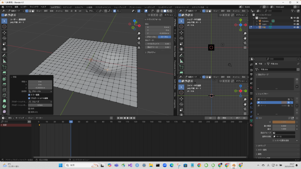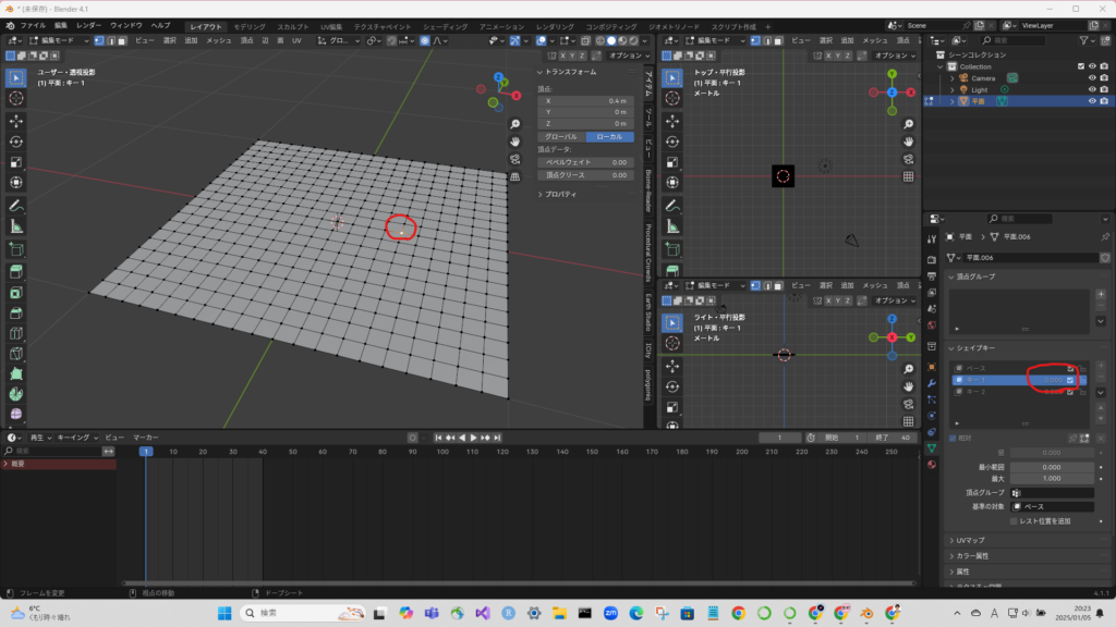 タイムラインを動かした後に、頂点を移動させる。