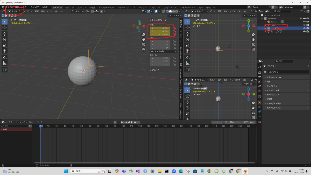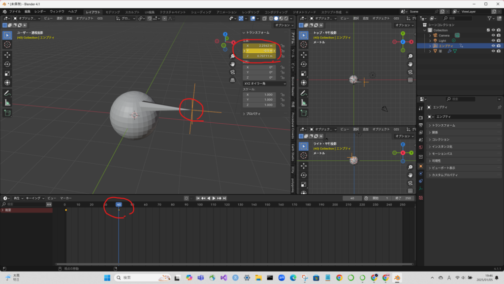 タイムラインを移動して、エンプティを動かした後、キーフレームを打つ。
