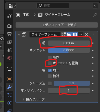 幅を調整。オリジナルを置換のチェックを外す。マテリアルインデックスを「1」にすることで面と線を分離する。