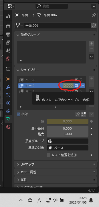 オブジェクトデータプロパティのシェイプキーの「+」ボタンを3回押す(移動したい箇所 + 1回)。