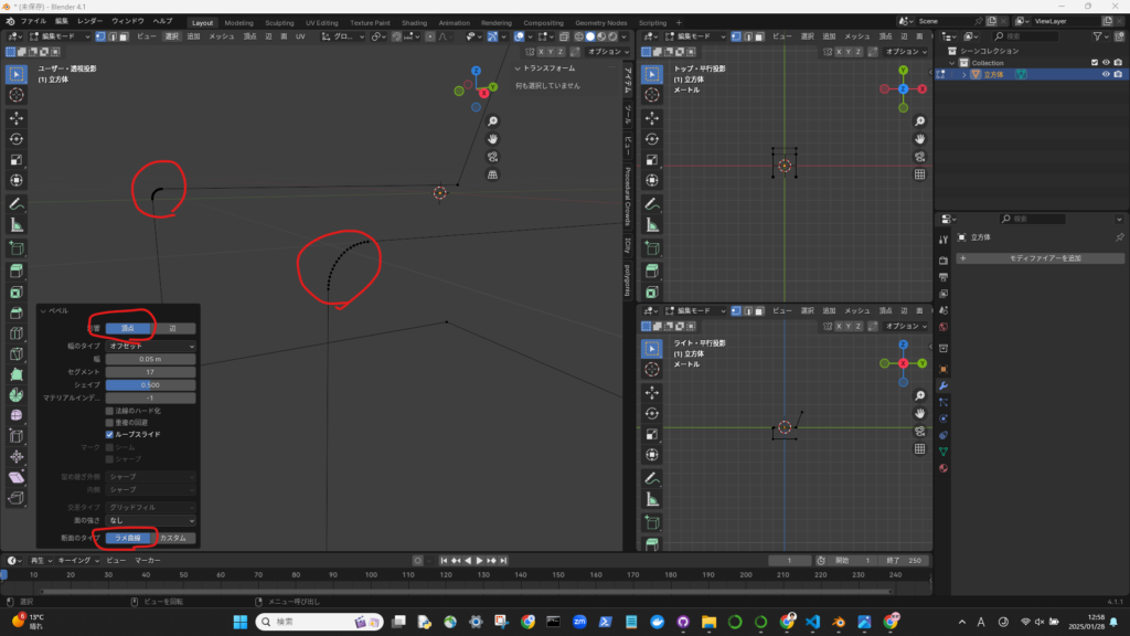 編集モードでメッシュの頂点を選択した後、Ctrl+Bでベベル。ポップアップウィンドウで、「頂点」、「ラメ曲線」を選択して、ベベル量を調整する。