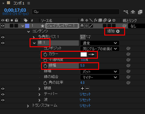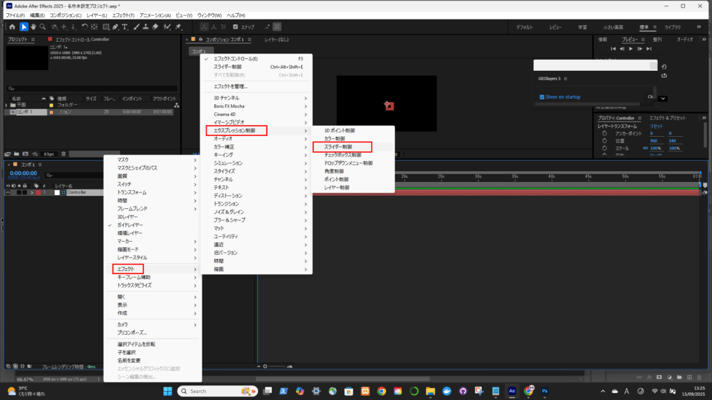 エフェクト→エクスプレッション制御→スライダー制御を選択(2つ複製して合計3つ作成)
