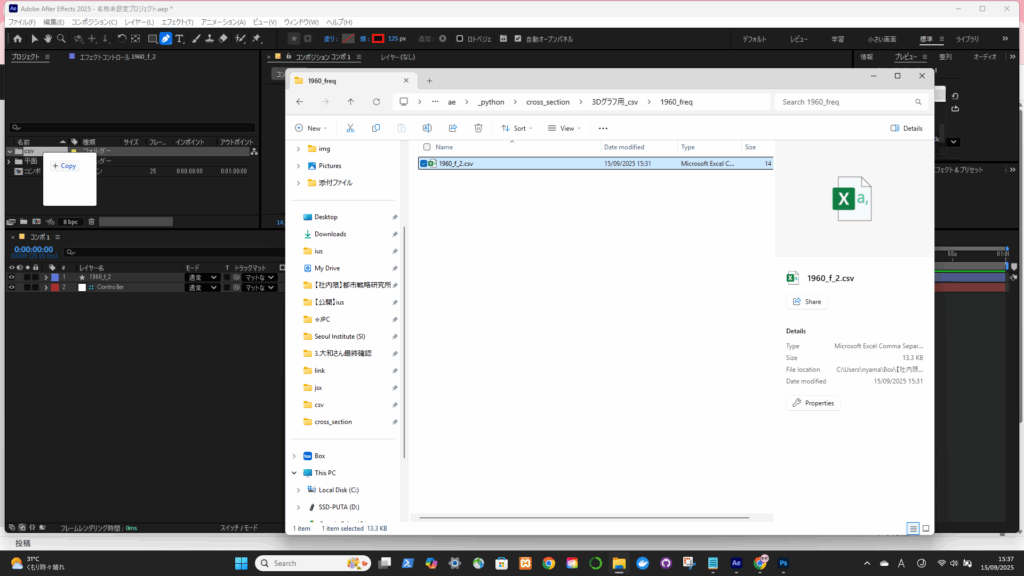 var values = thisComp.layer(“【ファイル名】.csv”).footage(“【ファイル名】.csv”).dataValue([【列番号】,i]);