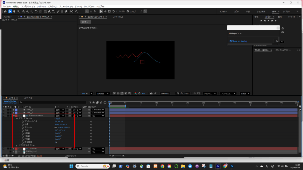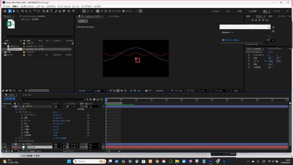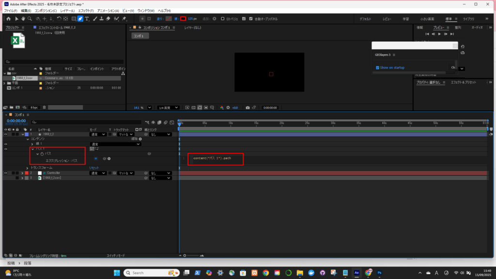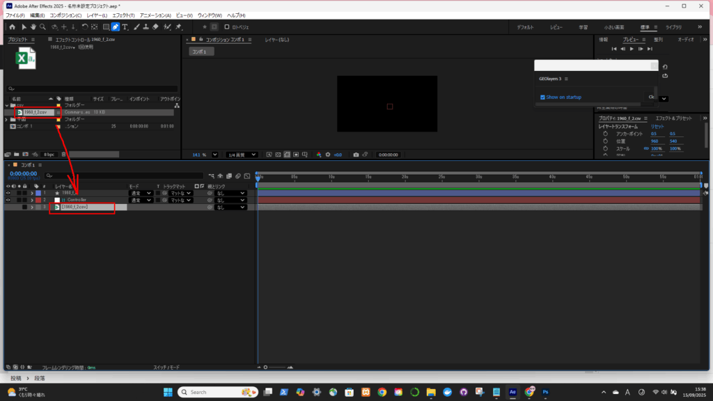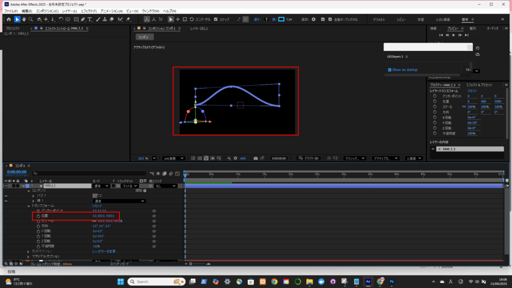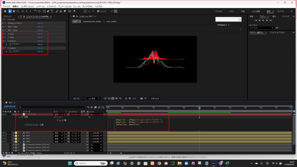 ※追加エフェクトもマニュアルで作業しないとエラーが出る可能性が高い。その際、ウィップでリンクさせると、temp = thisComp…..とxの分しか作成されないので、自分でyの分を書く必要あり。