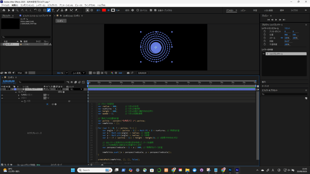 var angle = (i / (points – 1)) * Math.PI * 2 * numTurns; // 角度を計算