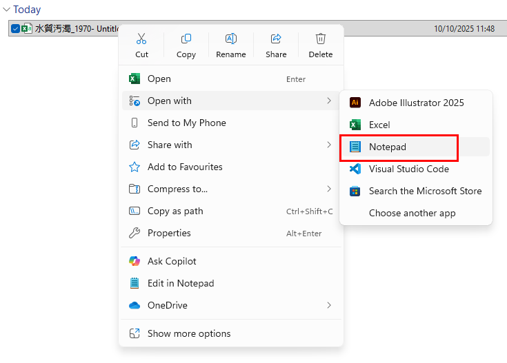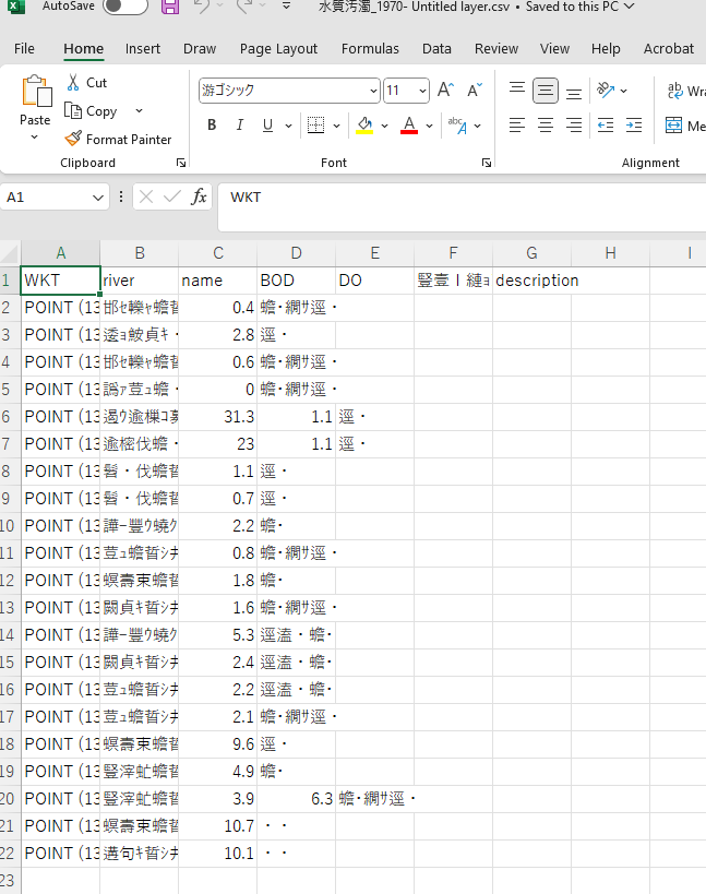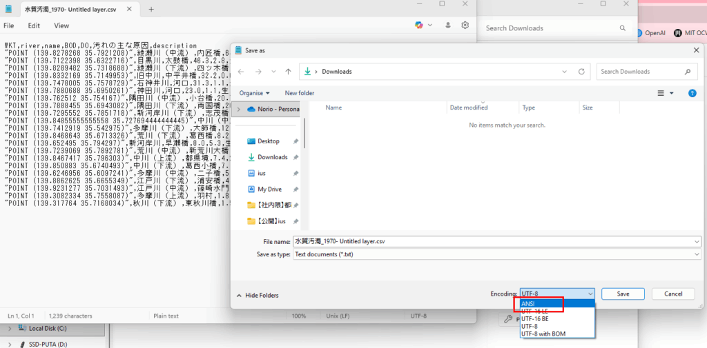 文字化けしている。一度ファイルを閉じて、メモ帳で開く。