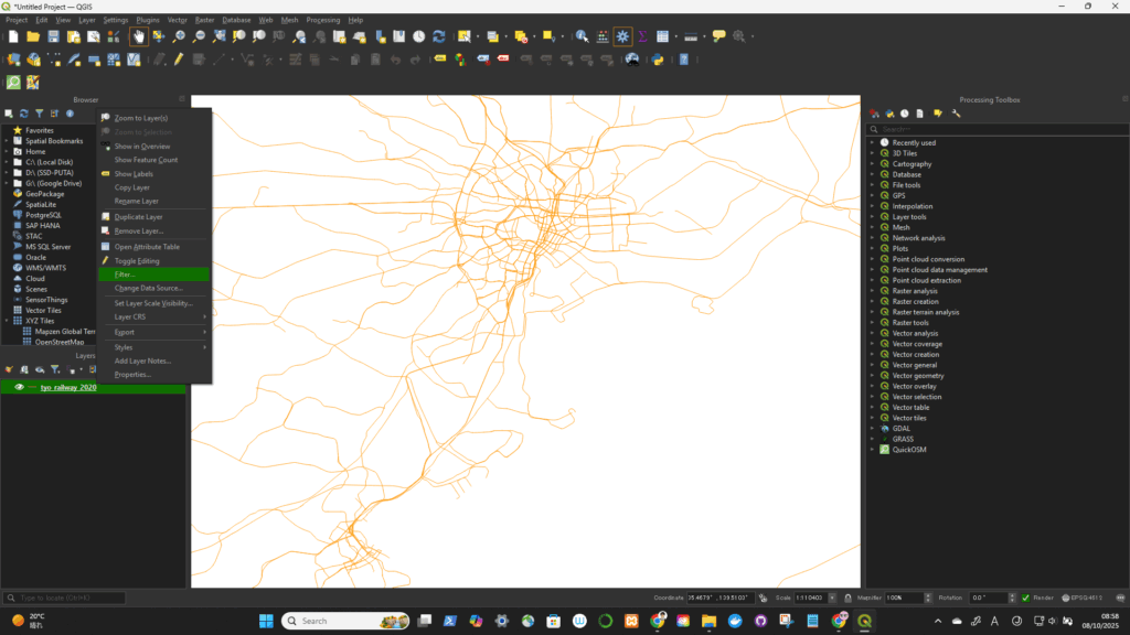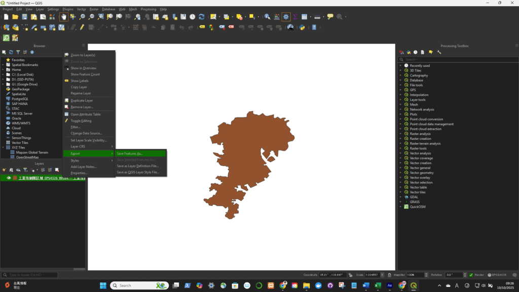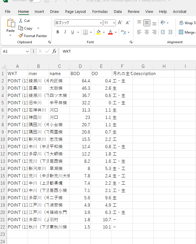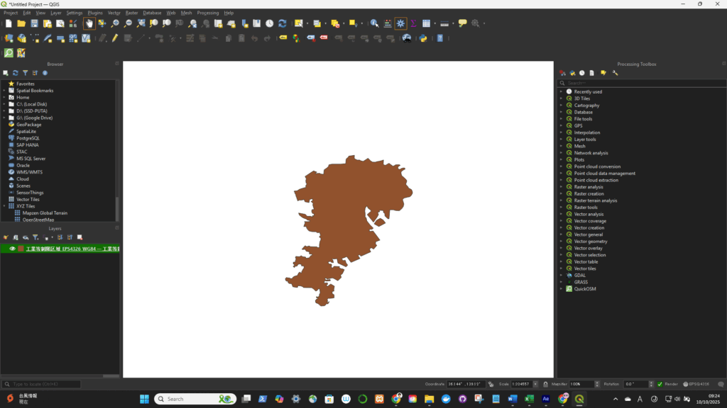 元ファイルを開く(今回はEPSG:4326(WGS84)をEPSG:4612(JGD2000)に変更する)
